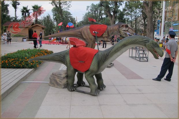 動(dòng) 作:張嘴叫聲、頭左右、身前后,后退伸曲、前肢擺動(dòng)、尾左右擺動(dòng)。投幣后觀(guān)眾可騎坐隨龍搖動(dòng)娛樂(lè)。